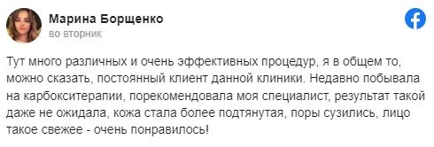 Тут много различных и очень эффективных процедур, я в общем то, можно сказать, постоянный клиент данной клиники. Недавно побывала на карбокситерапии, порекомендовала моя специалист, результат такой даже не ожидала, кожа стала более подтянутая, поры сузились, лицо такое свежее - очень понравилось!