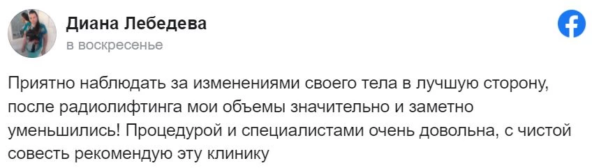 Приятно наблюдать за изменениями своего тела в лучшую сторону, после радиолифтинга мои объемы значительно и заметно уменьшились! Процедурой и специалистами очень довольна, с чистой совесть рекомендую эту клинику