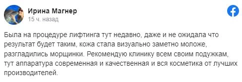 Была на процедуре лифтинга тут недавно, даже и не ожидала что результат будет таким, кожа стала визуально заметно моложе, разгладились морщинки. Рекомендую клинику всем своим подужкам, тут аппаратура современная и качественная и вся косметика от лучших производителей.