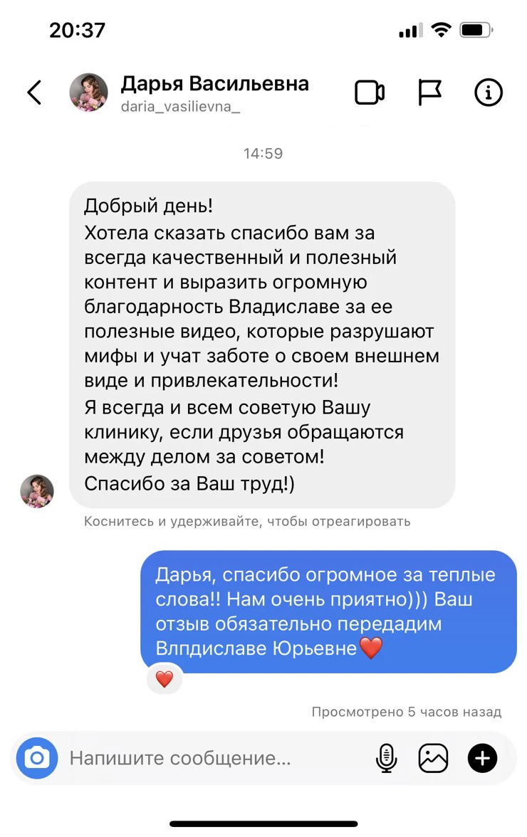 Довольна результатом от проведенных процедур. Мой любимый и неизменный доктор в лице Владиславы Юрьевны, помогает принять правильное решение и помочь выбрать процедуру, которая подходит именно мне. Посещаю клинику более 8 лет и не устану благодарить никогда!