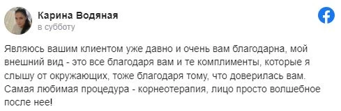 Являюсь вашим клиентом уже давно и очень вам благодарна, мой внешний вид - это все благодаря вам и те комплименты, которые я слышу от окружающих, тоже благодаря тому, что доверилась вам. Самая любимая процедура - корнеотерапия, лицо просто волшебное после нее!