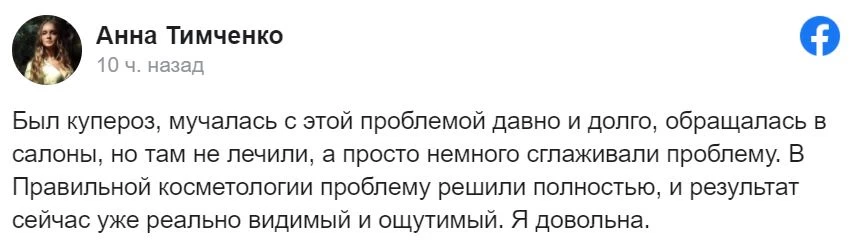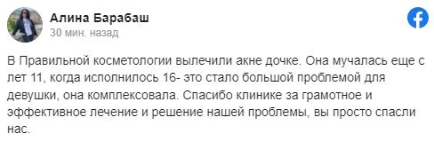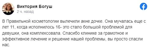 В Правильной косметологии вылечили акне дочке. Она мучалась еще с лет 11, когда исполнилось 16- это стало большой проблемой для девушки, она комплексовала. Спасибо клинике за грамотное и эффективное лечение и решение нашей проблемы, вы просто спасли нас.