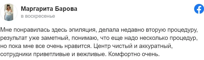 Мне понравилась здесь эпиляция, делала недавно вторую процедуру, результат уже заметный, понимаю, что еще надо несколько процедур, но пока мне все очень нравится. Центр чистый и аккуратный, сотрудники приветливые и вежливые. Комфортно очень.