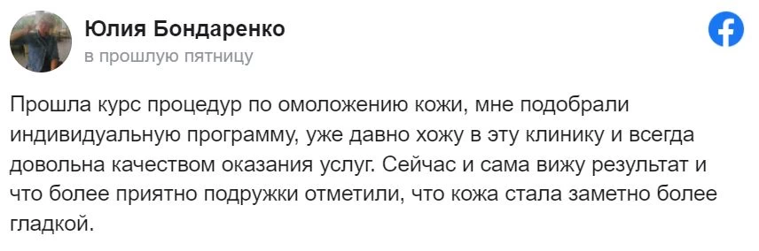 Применяют самые передовые технологии по омоложению, в частности у меня было аппаратное омоложение. Эффект проявился видимый и даже подруги заметили, все стали спрашивать где и что я делала, мне очень приятно. Благодарна клинике и специалистам