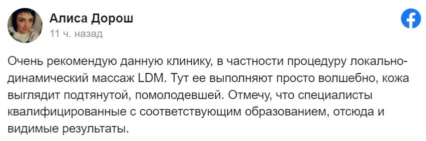 Очень рекомендую данную клинику, в частности процедуру локально-динамический массаж LDM. Тут ее выполняют просто волшебно, кожа выглядит подтянутой, помолодевшей. Отмечу, что специалисты квалифицированные с соответствующим образованием, отсюда и видимые результаты.