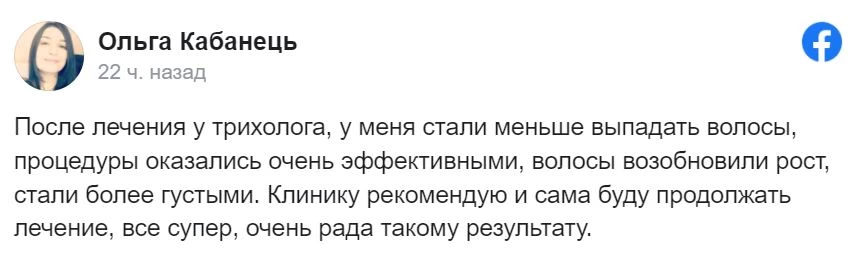 После лечения у трихолога, у меня стали меньше выпадать волосы, процедуры оказались очень эффективными, волосы возобновили рост, стали более густыми. Клинику рекомендую и сама буду продолжать лечение, все супер, очень рада такому результату.