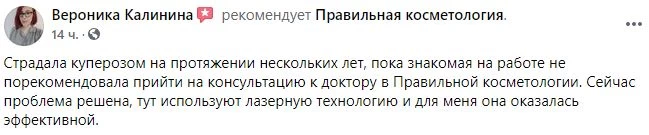 Страдала куперозом на протяжении нескольких лет, пока знакомая на работе не порекомендовала прийти на консультацию к доктору в Правильной косметологии. Сейчас проблема решена, тут используют лазерную технологию и для меня она оказалась эффективной.