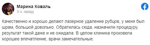 Качественно и хорошо делают лазерное удаление рубцов, у меня был шрам, большой довольно. Обратилась сюда, назначили процедуру, результат такой даже и не ожидала. В целом клиника произвела хорошее впечатление, врачи замечательные.