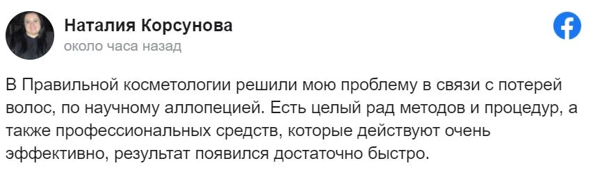В Правильной косметологии решили мою проблему в связи с потерей волос, по научному аллопецией. Есть целый рад методов и процедур, а также профессиональных средств, которые действуют очень эффективно, результат появился достаточно быстро.