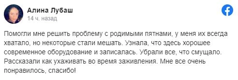 Помогли мне решить проблему с родимыми пятнами, у меня их всегда хватало, но некоторые стали мешать. Узнала, что здесь хорошее современное оборудование и записалась. Убрали все, что смущало. Рассказали как ухаживать во время заживления. Мне все очень понравилось, спасибо!