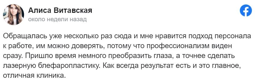Обращалась уже несколько раз сюда и мне нравится подход персонала к работе, им можно доверять, потому что профессионализм виден сразу. Пришло время немного преобразить глаза, а точнее сделать лазерную блефаропластику. Как всегда результат есть и это главное, отличная клиника.