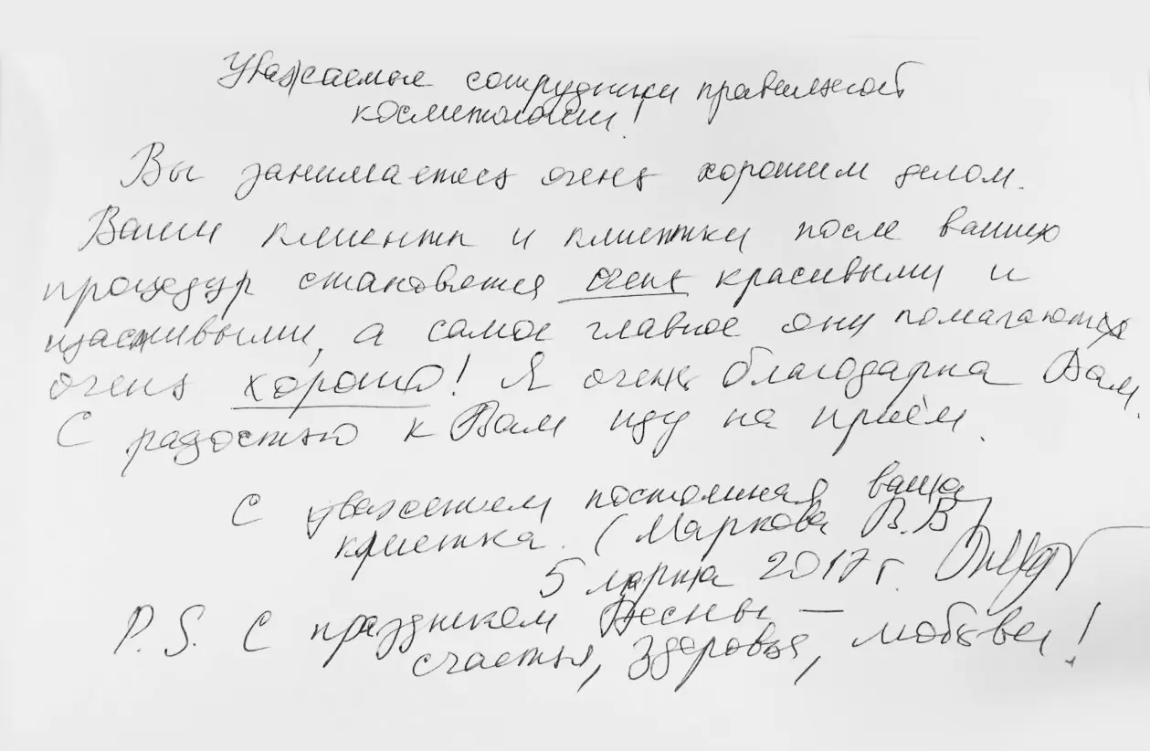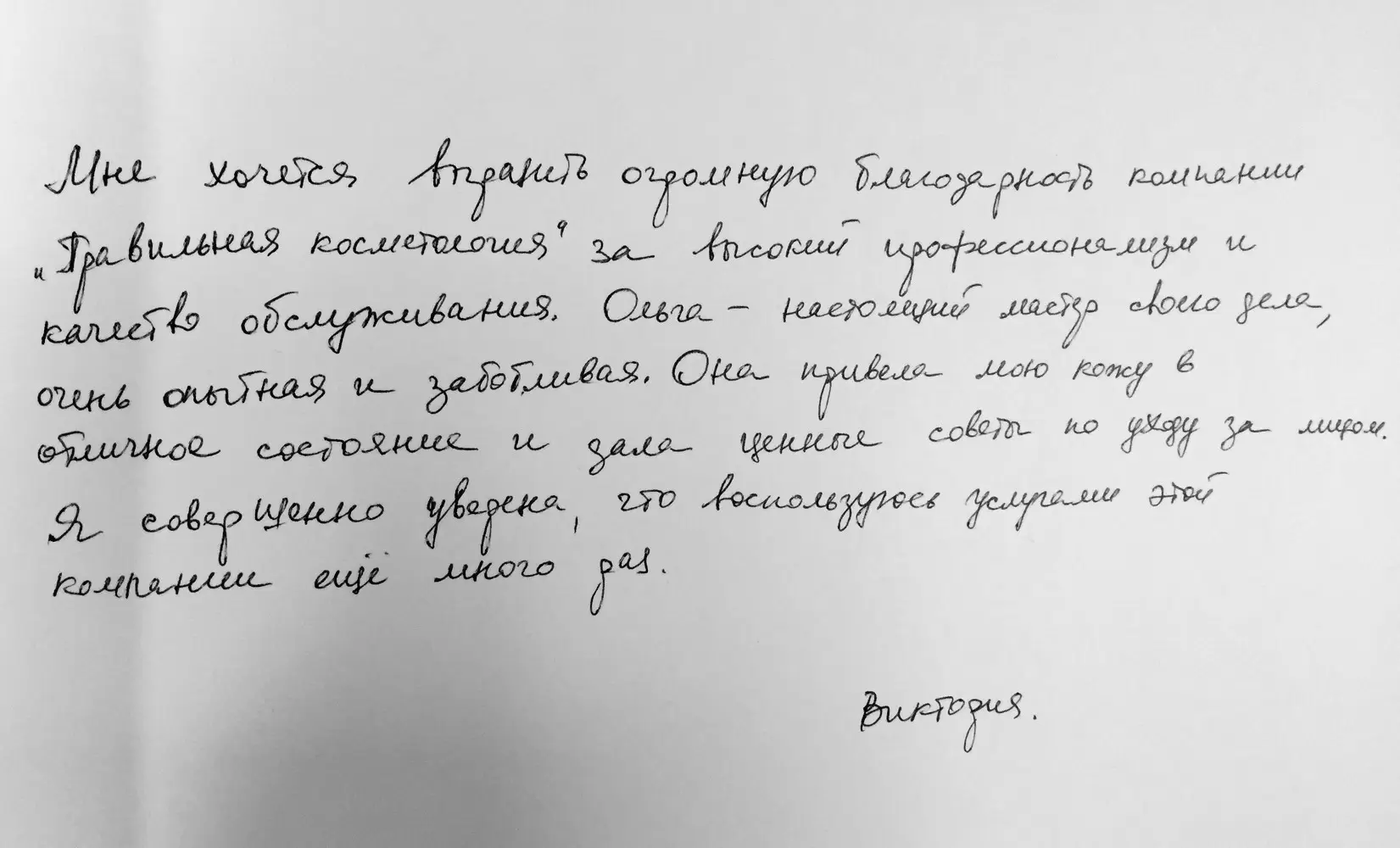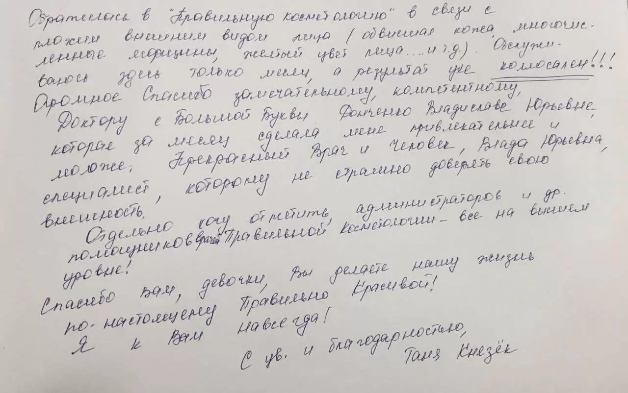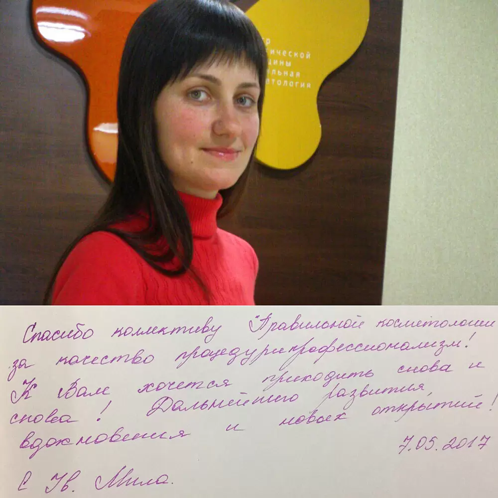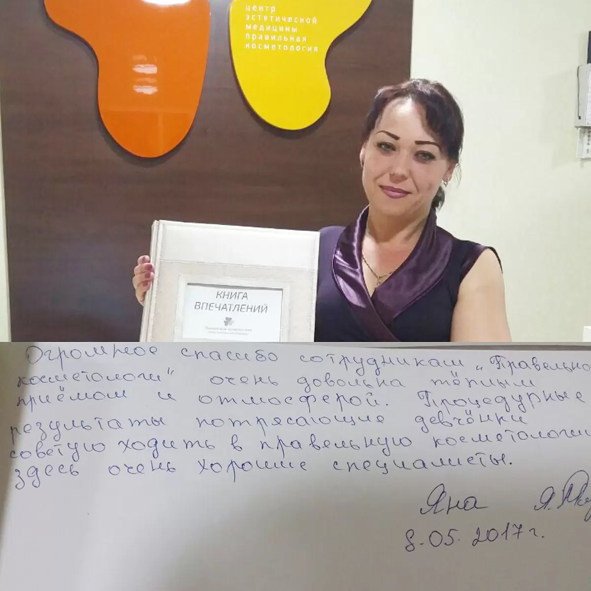 Хотелось бы поблагодарить коллектив Правильной косметологии за отличную работу. Прошла курс лазерной эпиляции и осталась очень довольна результатами. Делала различные процедуры, которые также порадовали результатами. В коллективе работает профессионалы своего дела, которые находят индивидуальный подход к каждому клиенту и готовы ответить на любой Ваш вопрос. Отдельно хотелось поблагодарить Анну и Владиславу, а также администрацию, которая всегда с улыбкой подбирает для Вас удобное время и напоминает о Вашей записи заблаговременно.