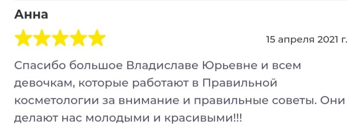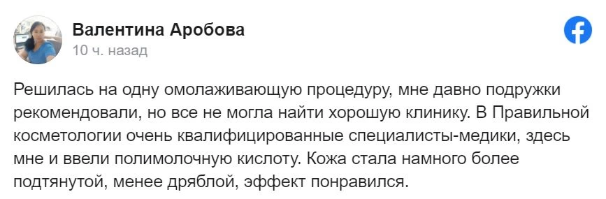 Решилась на одну омолаживающую процедуру, мне давно подружки рекомендовали, но все не могла найти хорошую клинику. В Правильной косметологии очень квалифицированные специалисты-медики, здесь мне и ввели полимолочную кислоту. Кожа стала намного более подтянутой, менее дряблой, эффект понравился.