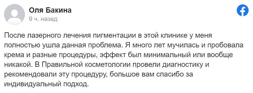 После лазерного лечения пигментации в этой клинике у меня полностью ушла данная проблема. Я много лет мучилась и пробовала крема и разные процедуры, эффект был минимальный или вообще никакой. В Правильной косметологии провели диагностику и рекомендовали эту процедуру, большое вам спасибо за индивидуальный подход.