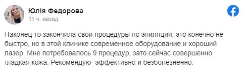Наконец то закончила свои процедуры по эпиляции, это конечно не быстро, но в этой клинике современное оборудование и хороший лазер. Мне потребовалось 9 процедур, зато сейчас совершенно гладкая кожа. Рекомендую- эффективно и безболезненно.