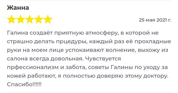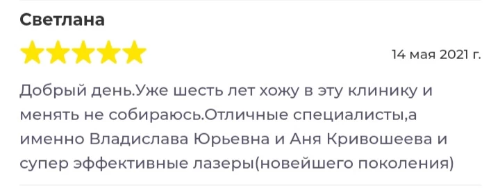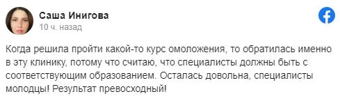 Когда решила пройти какой-то курс омоложения, то обратилась именно в эту клинику, потому что считаю, что специалисты должны быть с соответствующим образованием. Осталась довольна, специалисты молодцы! Результат превосходный!