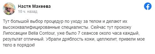 Тут большой выбор процедур по уходу за телом и делают их высококвалифицированные специалисты. Сейчас тут прохожу Липосакции Bella Contour, уже было 7 сеансов около часа каждый, результат отличный. Убрали дряблость кожи, целлюлит, привели мое тело в порядок!