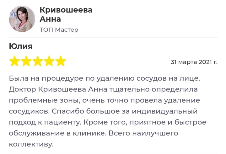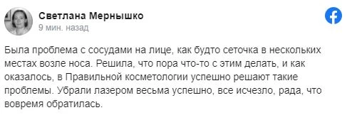 Была проблема с сосудами на лице, как будто сеточка в нескольких местах возле носа. Решила, что пора что-то с этим делать, и как оказалось, в Правильной косметологии успешно решают такие проблемы. Убрали лазером весьма успешно, все исчезло, рада, что вовремя обратилась.