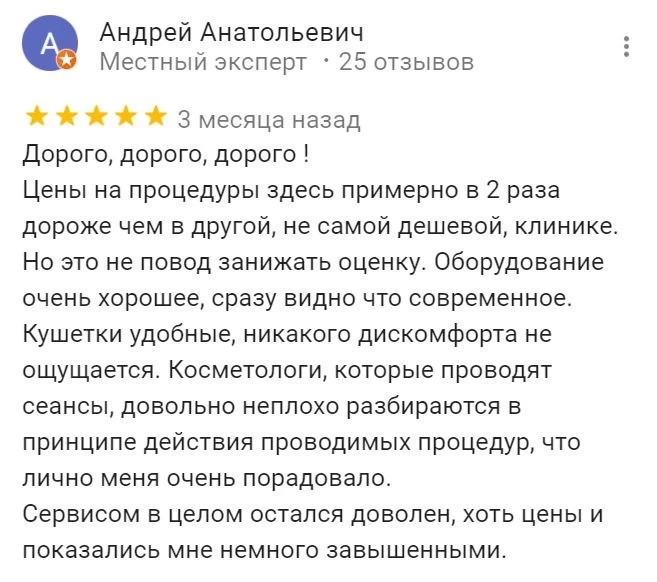 Но это не повод занижать оценку. Оборудование очень хорошее, сразу видно что современное. Кушетки удобные, никакого дискомфорта не ощущается. Косметологи, которые проводят сеансы, довольно неплохо разбираются в принципе действия проводимых процедур, что лично меня очень порадовало.