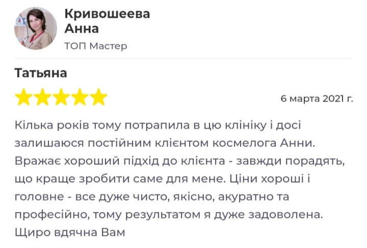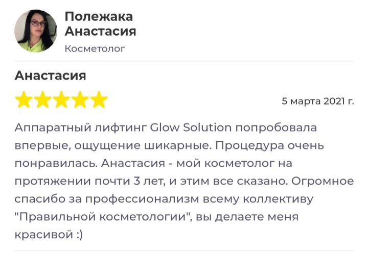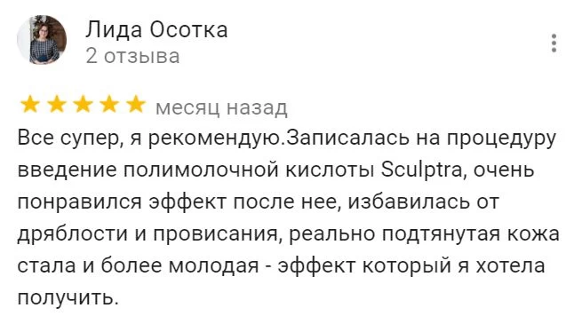 Все супер, я рекомендую.Записалась на процедуру введение полимолочной кислоты Sculptra, очень понравился эффект после нее, избавилась от дряблости и провисания, реально подтянутая кожа стала и более молодая - эффект который я хотела получить.