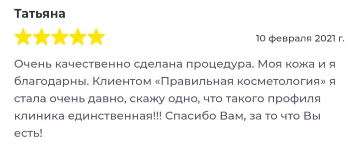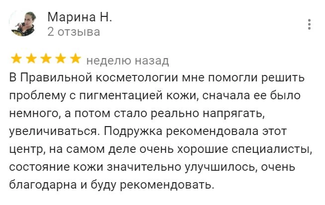 В Правильной косметологии мне помогли решить проблему с пигментацией кожи, сначала ее было немного, а потом стало реально напрягать, увеличиваться. Подружка рекомендовала этот центр, на самом деле очень хорошие специалисты, состояние кожи значительно улучшилось, очень благодарна и буду рекомендовать.