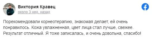 Порекомендовали корнеотерапию, знакомая делает, ей очень понравилось. Кожа увлажненная, цвет лица стал лучше, свежее. Результат отличный. Я тоже записалась, и очень довольна, спасибо!