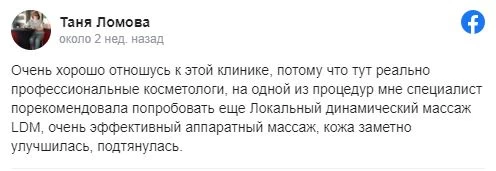 Очень хорошо отношусь к этой клинике, потому что тут реально профессиональные косметологи, на одной из процедур мне специалист порекомендовала попробовать еще Локальный динамический массаж LDM, очень эффективный аппаратный массаж, кожа заметно улучшилась, подтянулась.