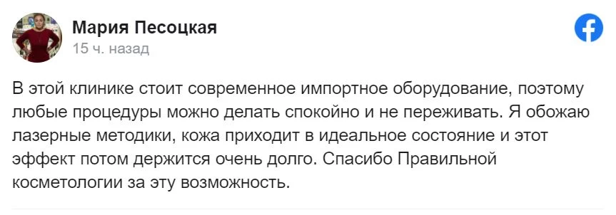В этой клинике стоит современное импортное оборудование, поэтому любые процедуры можно делать спокойно и не переживать. Я обожаю лазерные методики, кожа приходит в идеальное состояние и этот эффект потом держится очень долго. Спасибо Правильной косметологии за эту возможность.