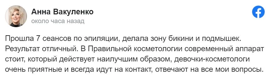 Прошла 7 сеансов по эпиляции, делала зону бикини и подмышек. Результат отличный. В Правильной косметологии современный аппарат стоит, который действует наилучшим образом, девочки-косметологи очень приятные и всегда идут на контакт, отвечают на все мои вопросы.